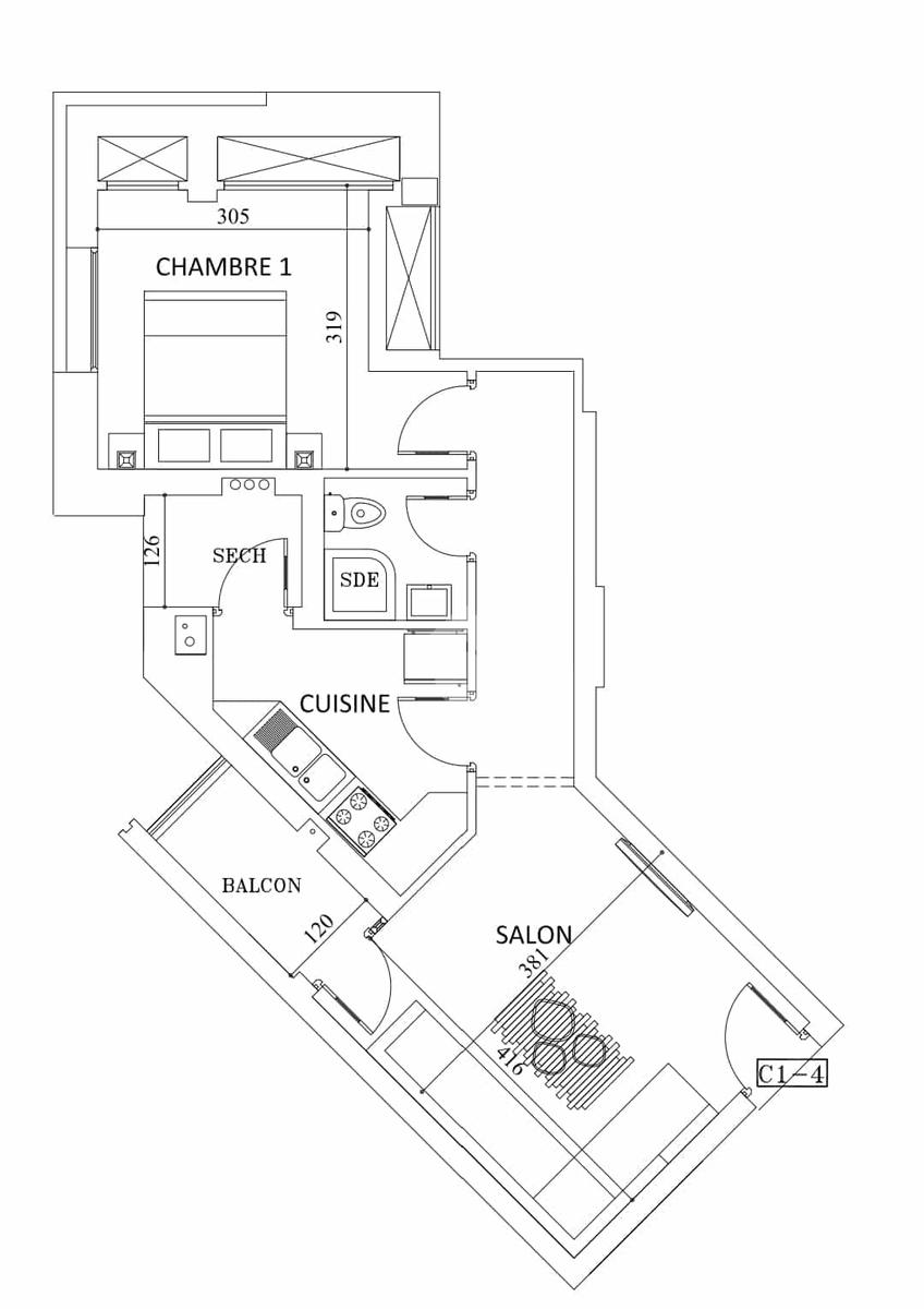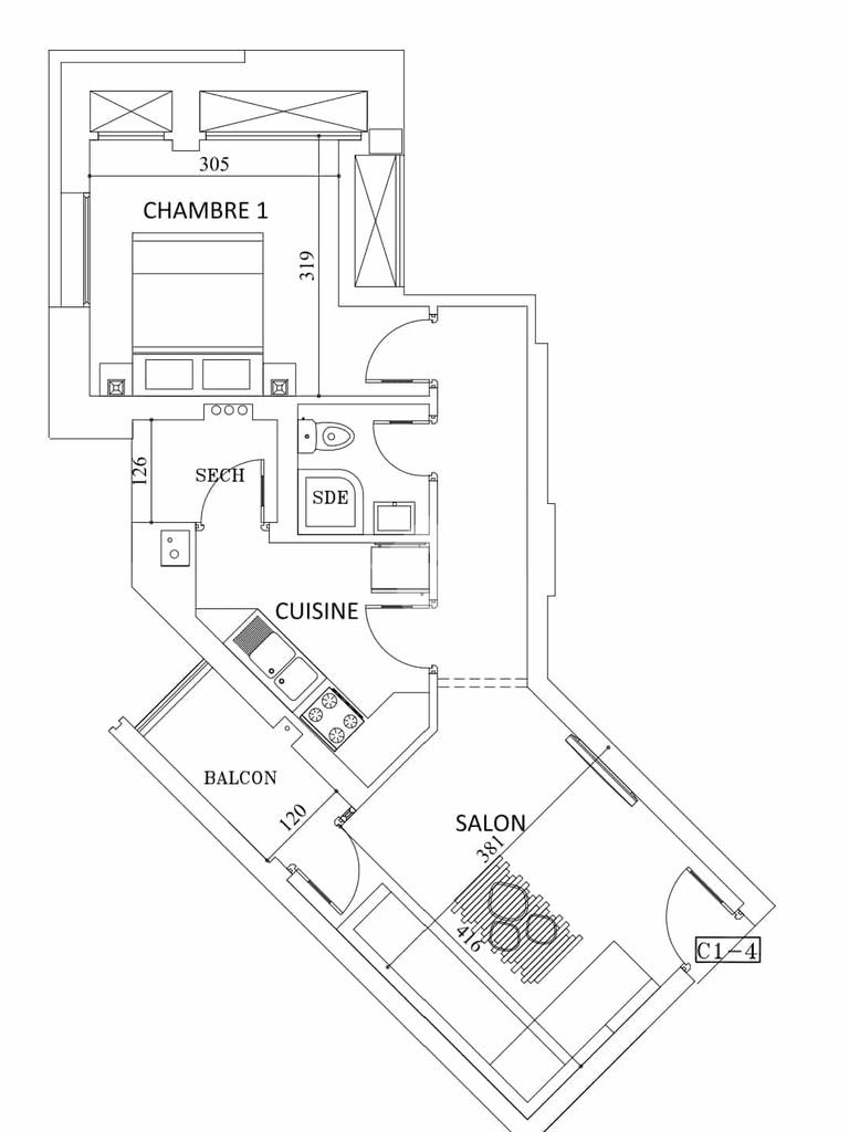 il se distingue par son salon lumineux avec balcon, une chambre à coucher avec dressing, une cuisine aménagée avec des rangements et équipée par une plaque chauffante, hotte aspirante et un four .et une salle de douche L’appartement est pourvu d’un système de chauffage central et d'un climatiseur.